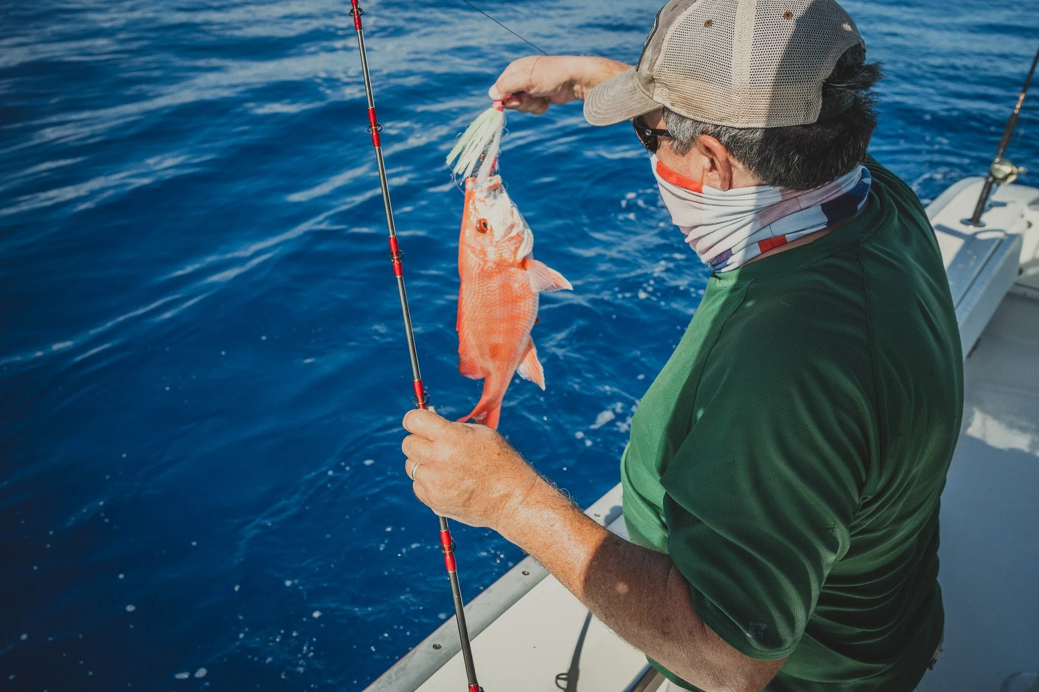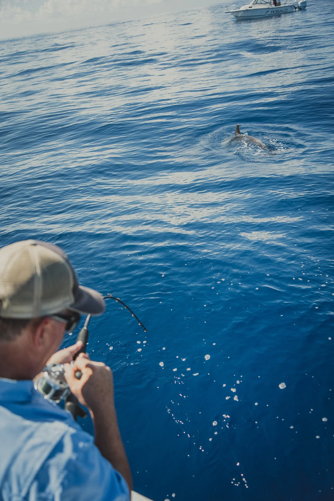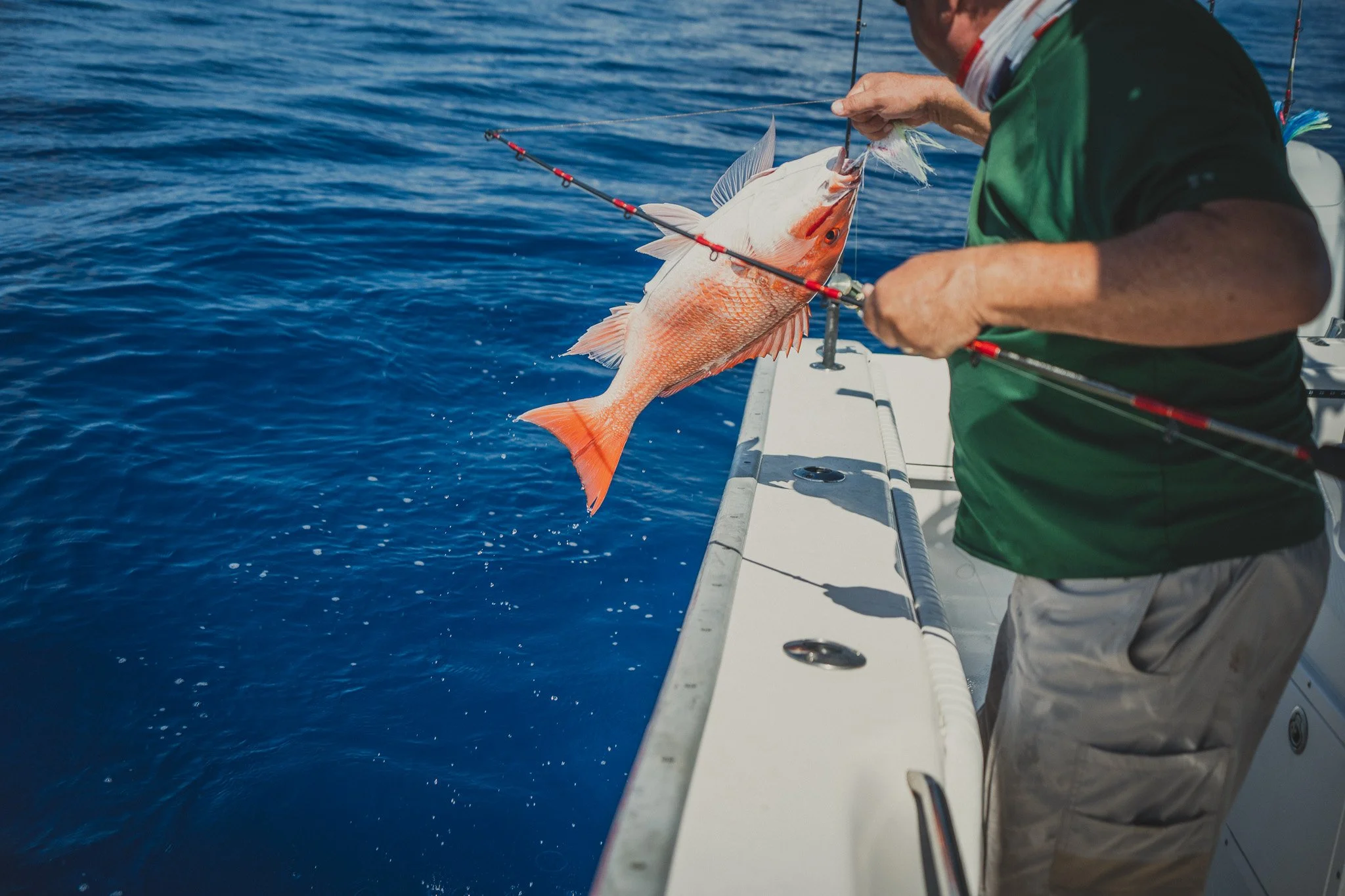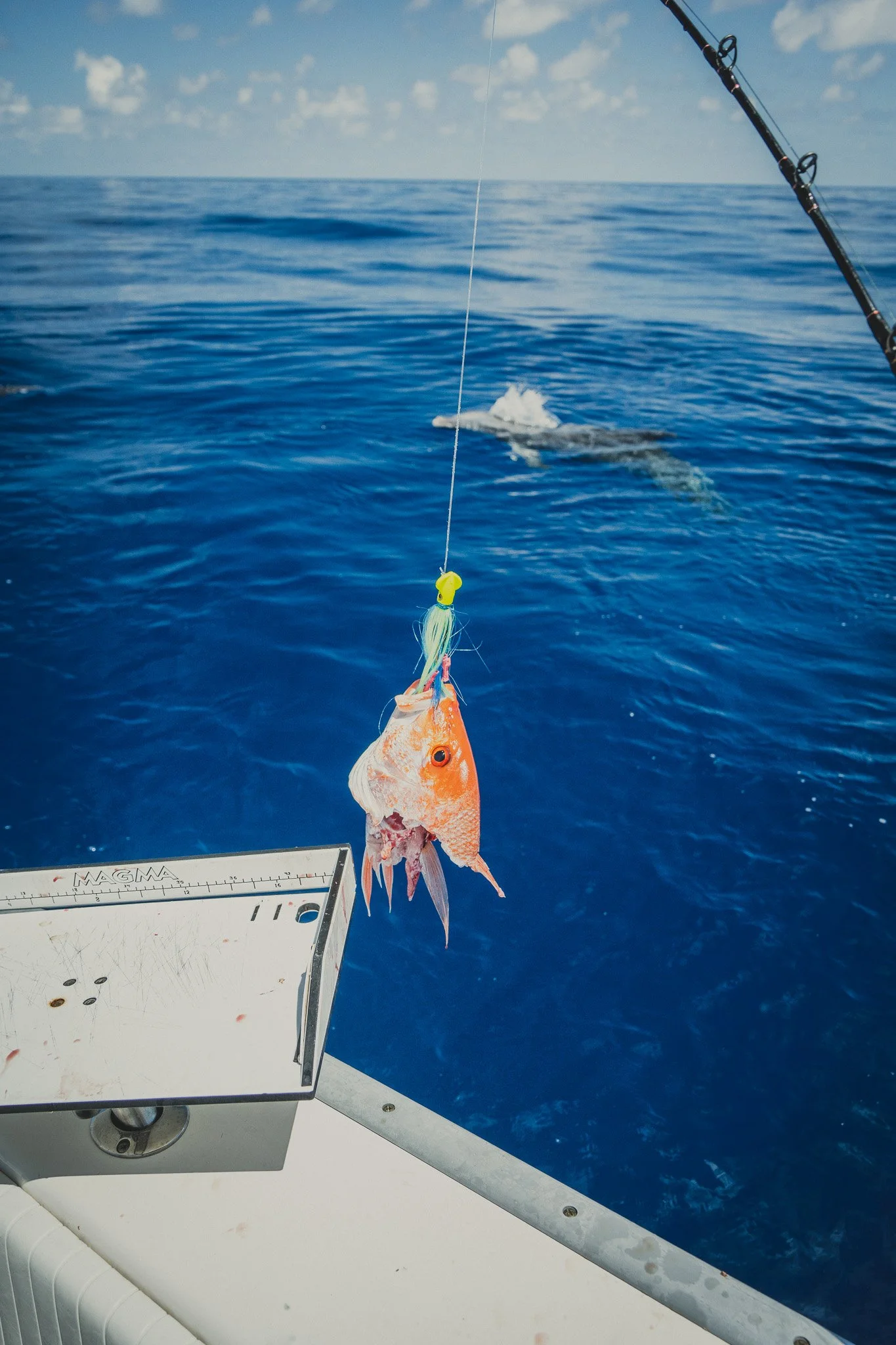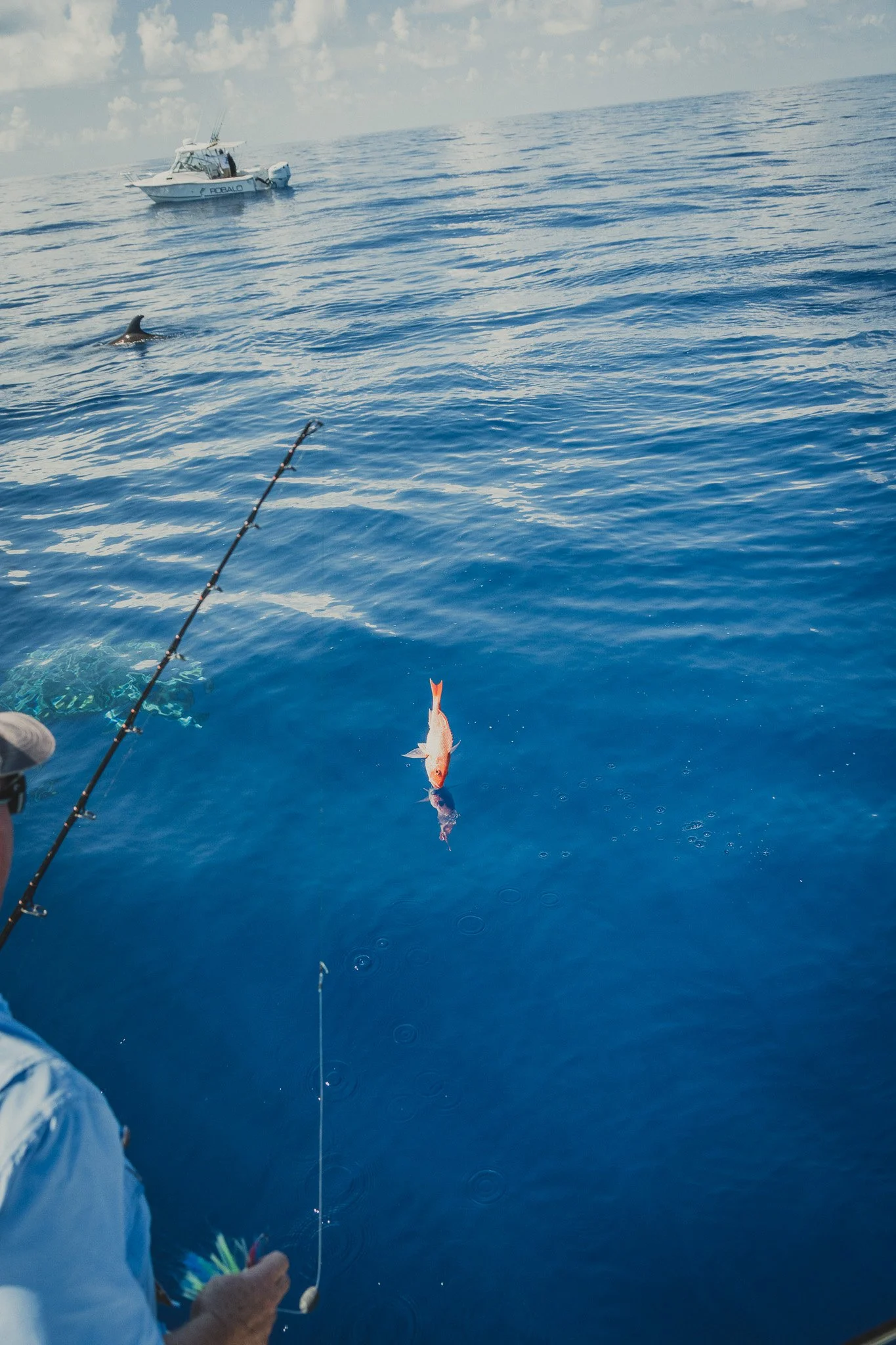 Extremely intelligent Bottlenose Dolphins waiting to snack on an unlucky Red Snapper that is too small to keep. Some escape. Most do not.