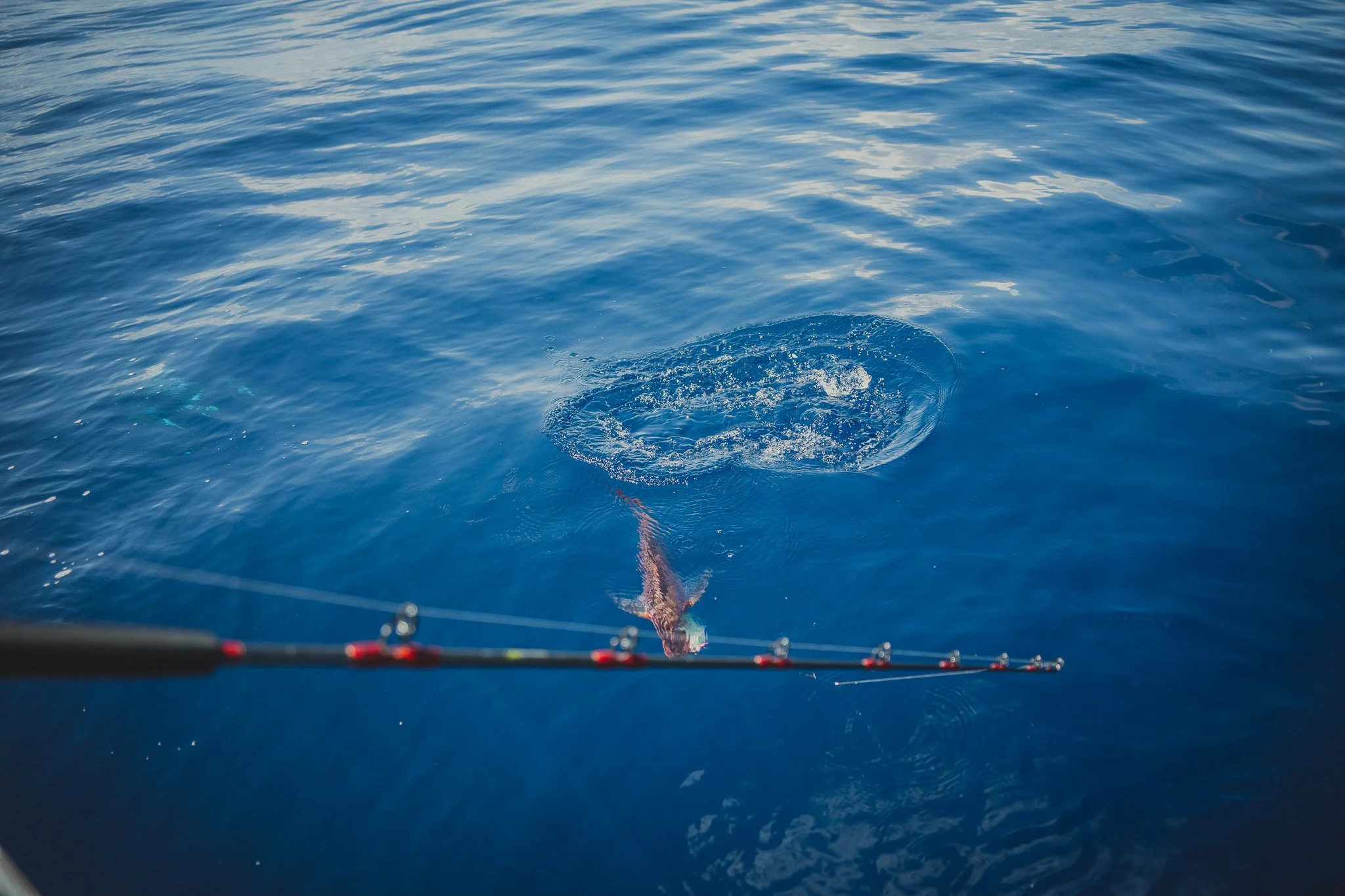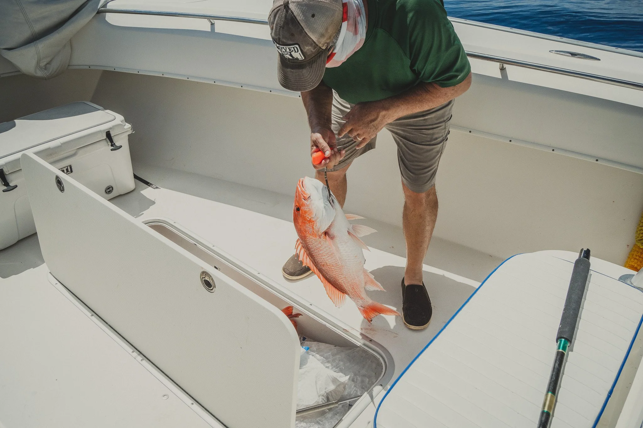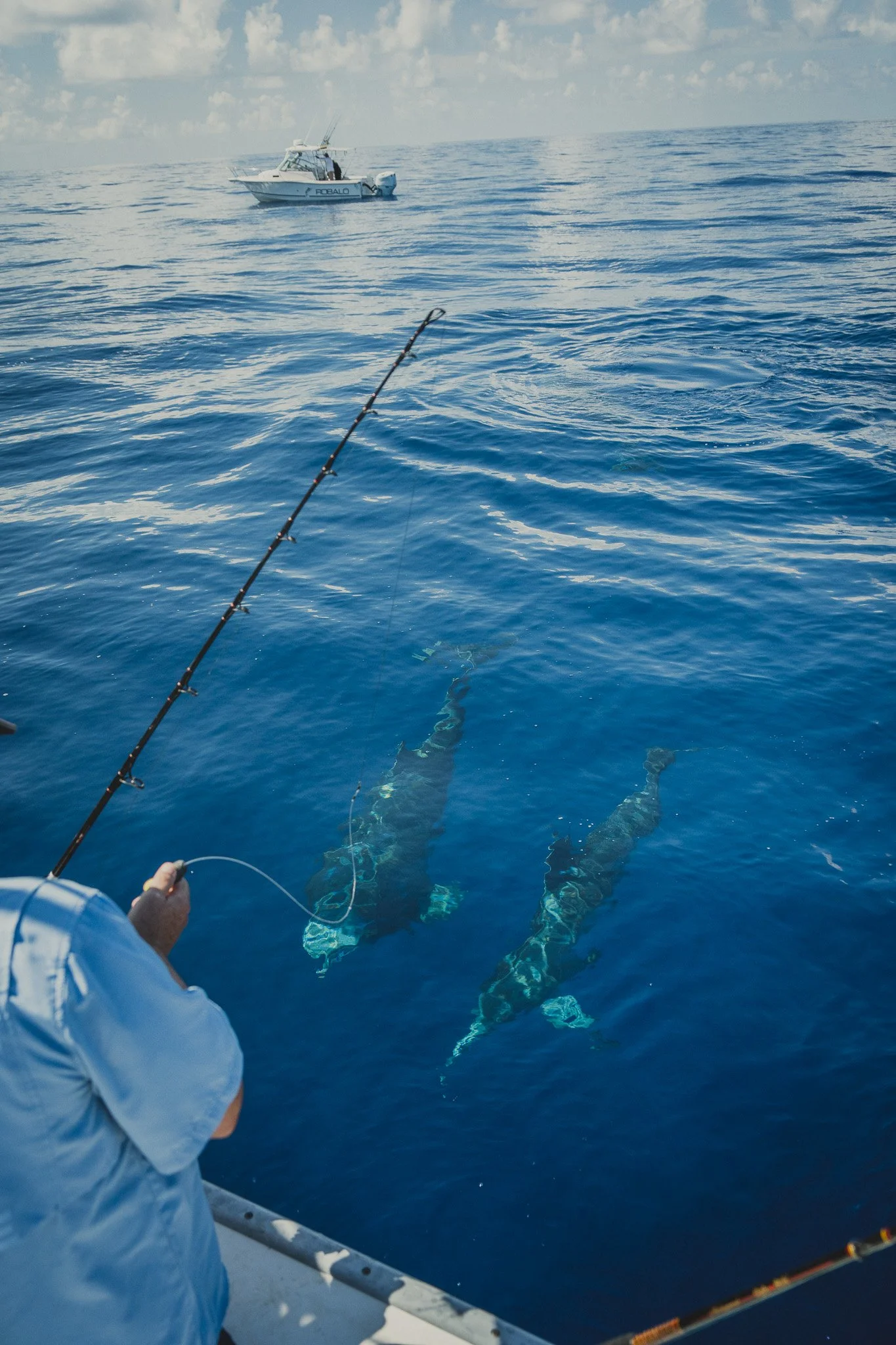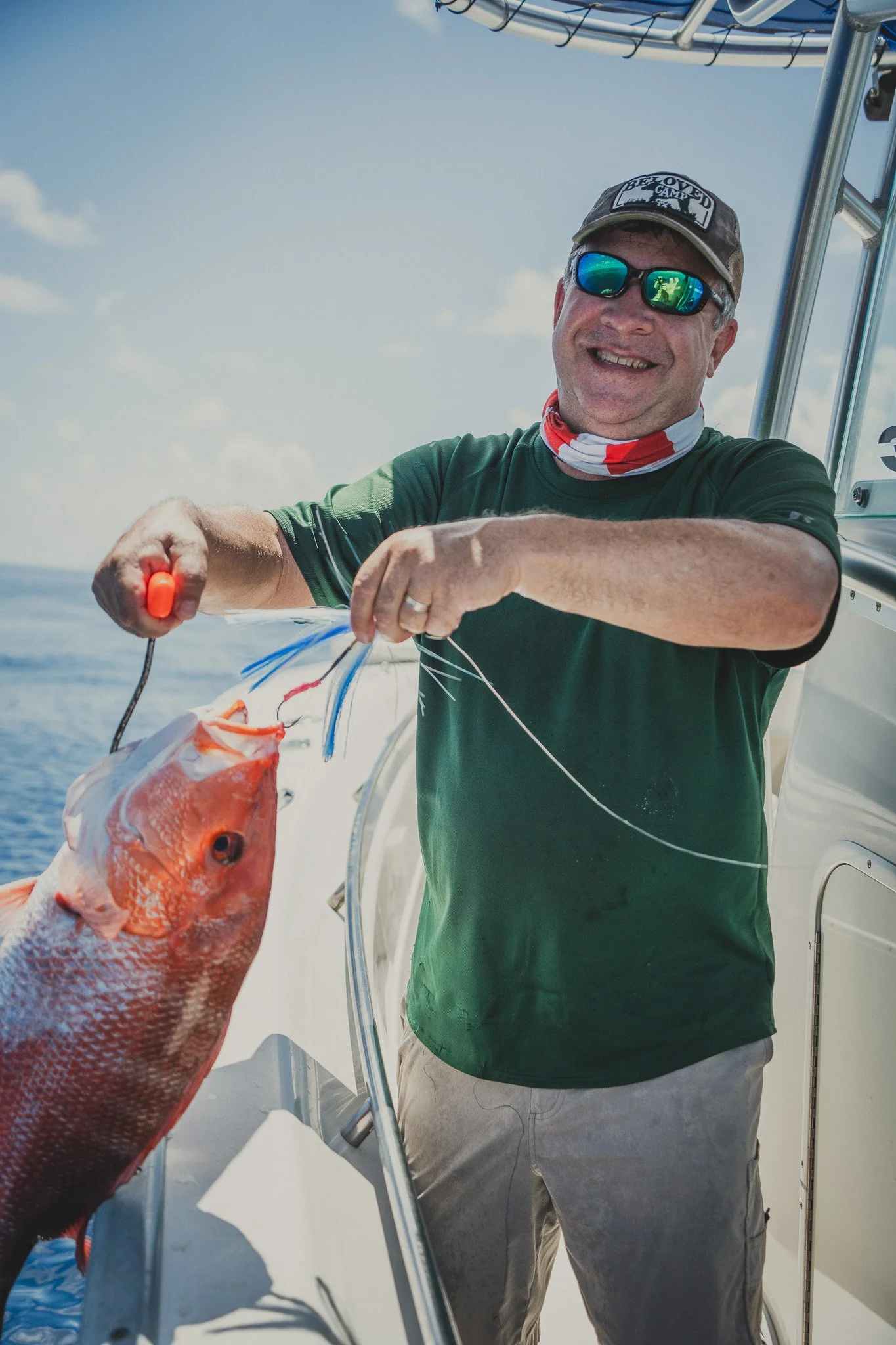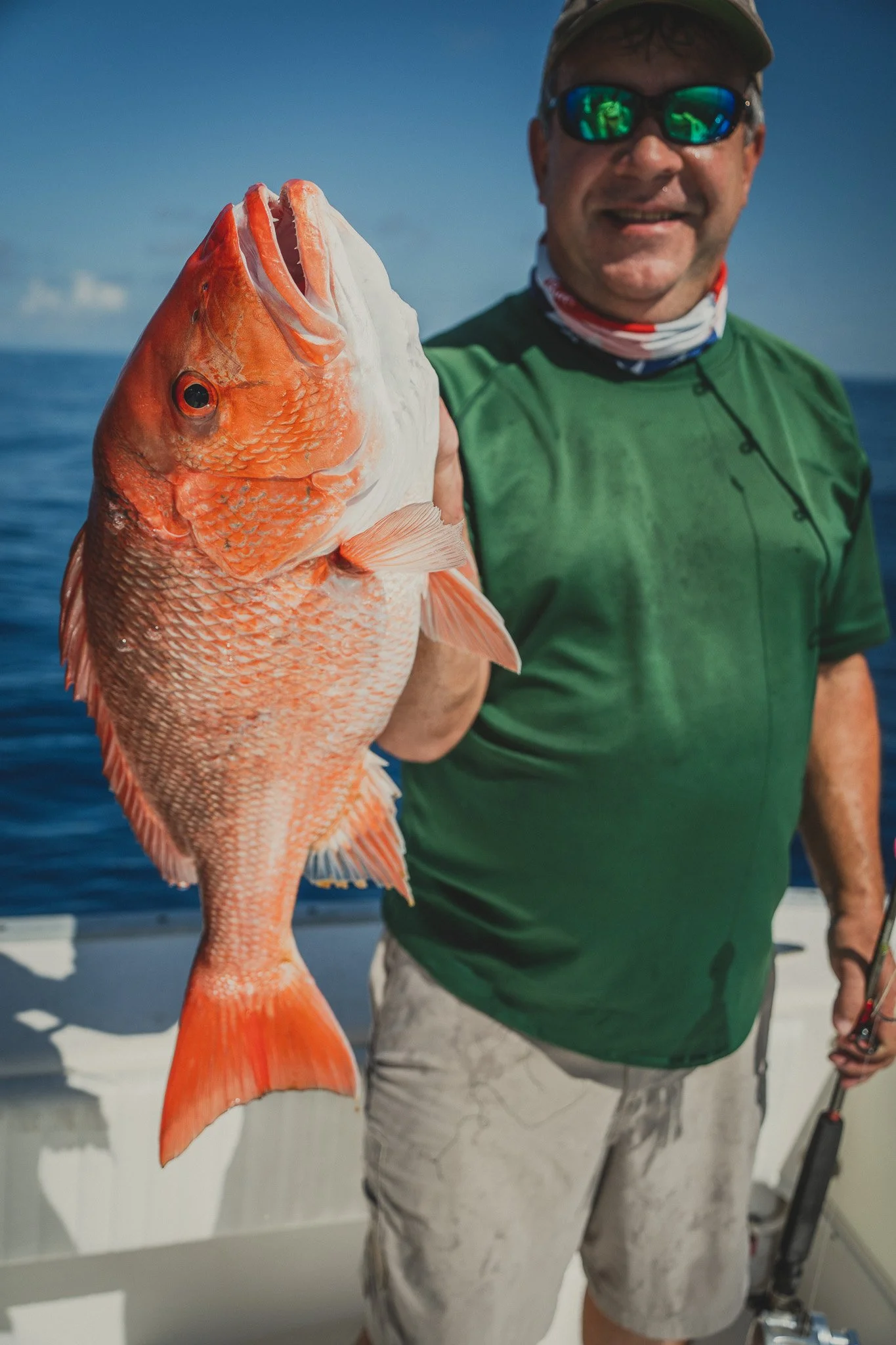 Extremely intelligent Bottlenose Dolphins waiting to snack on an unlucky Red Snapper that is too small to keep. Some escape. Most do not.