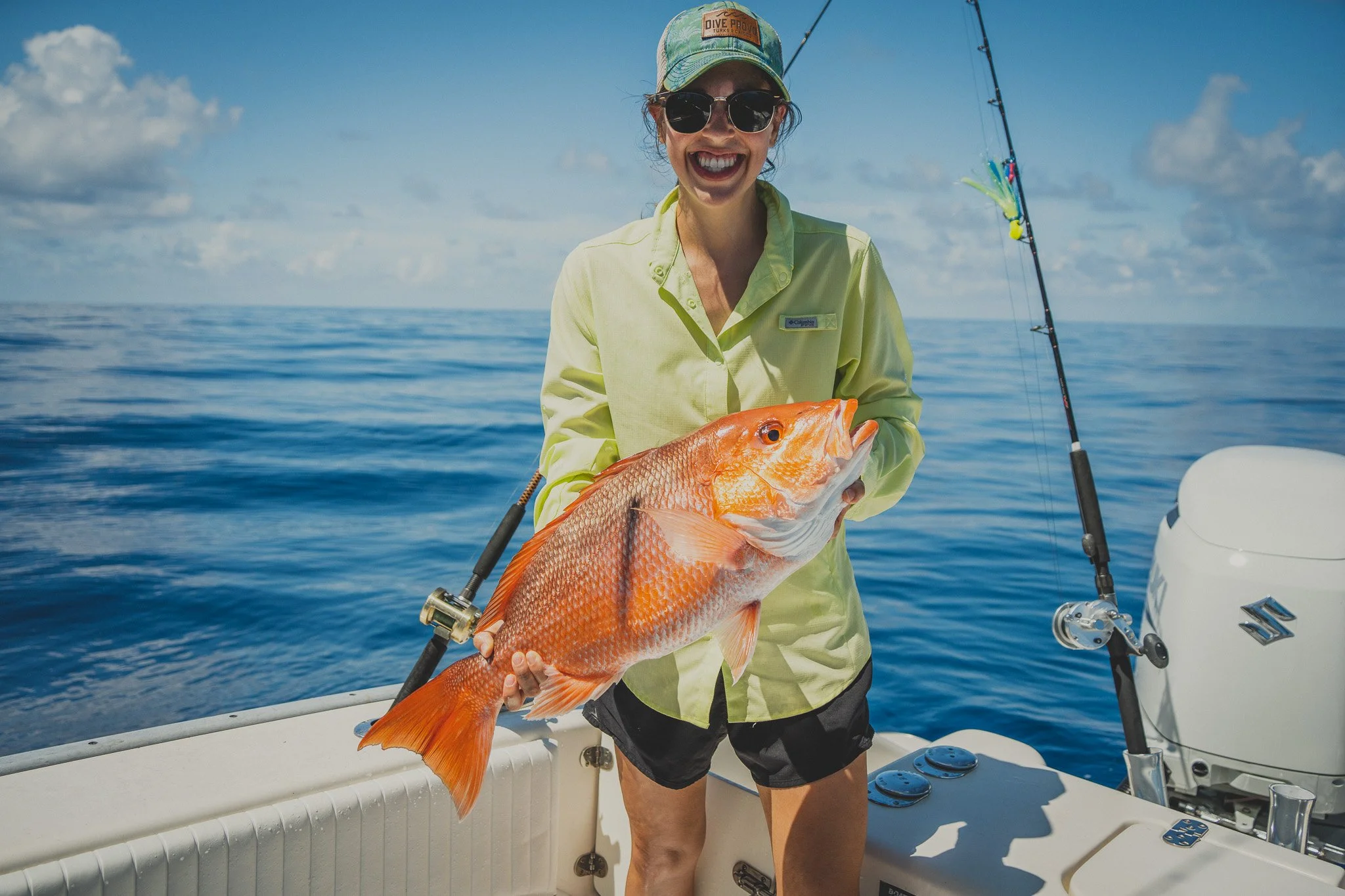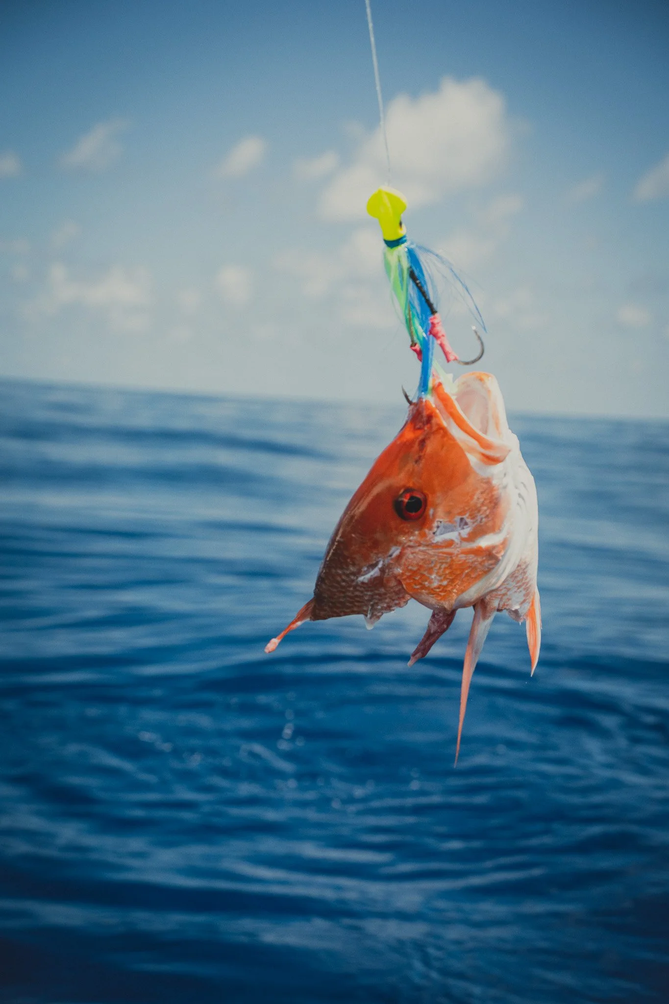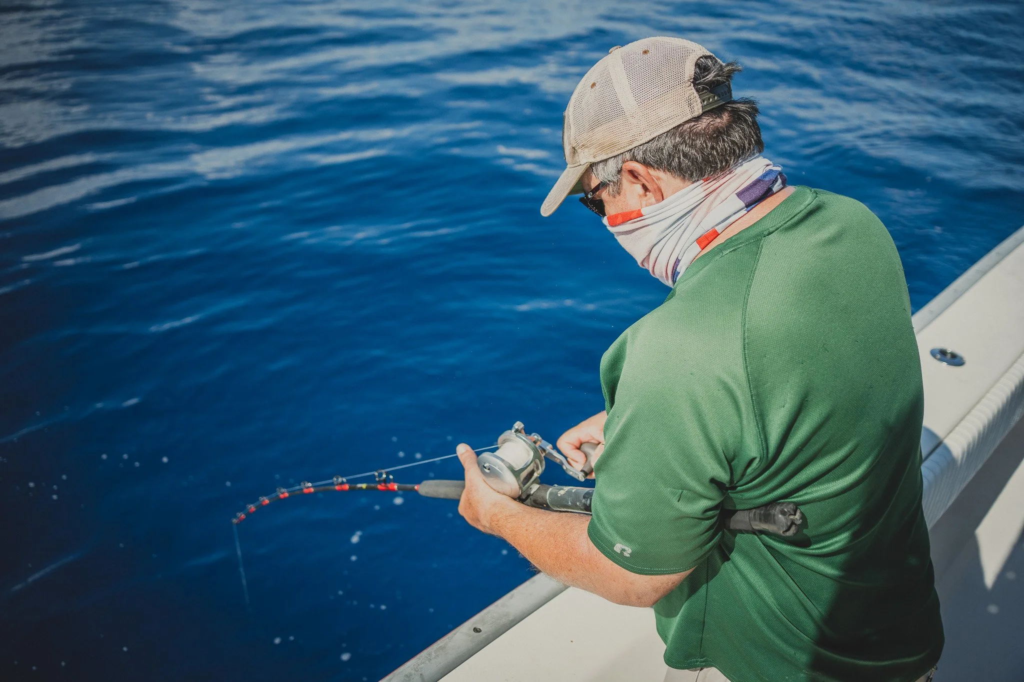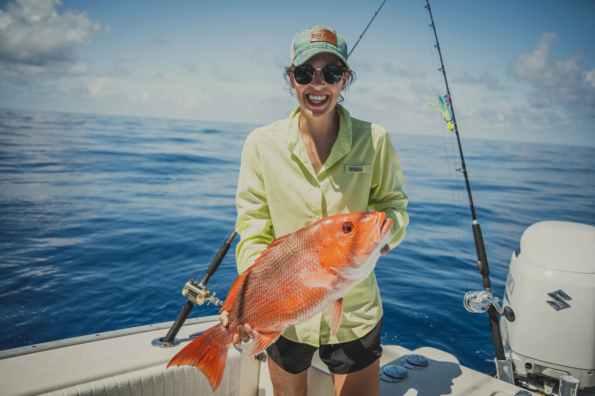 Extremely intelligent Bottlenose Dolphins waiting to snack on an unlucky Red Snapper that is too small to keep. Some escape. Most do not.
