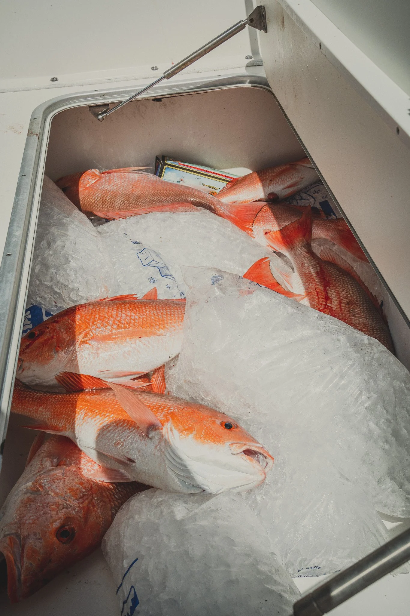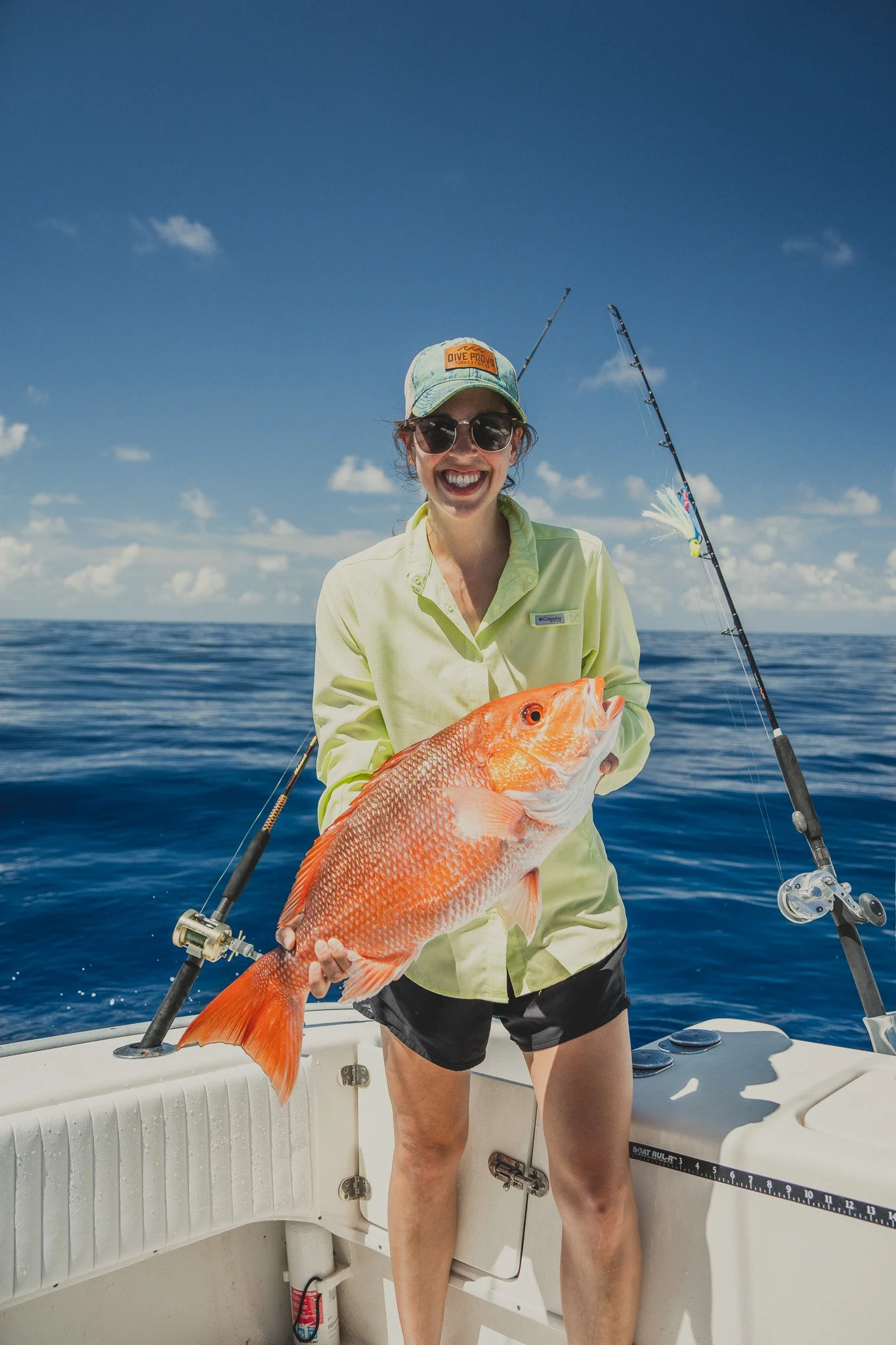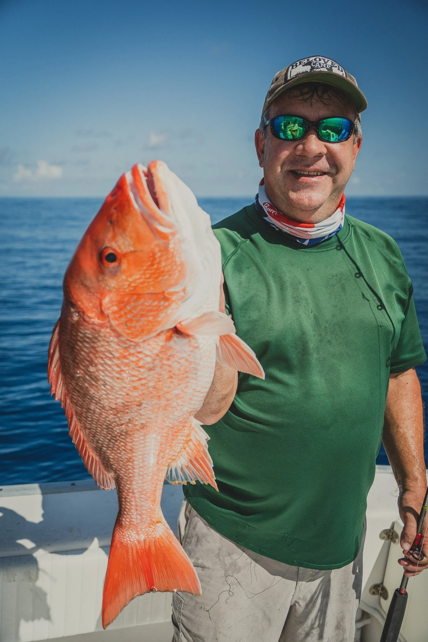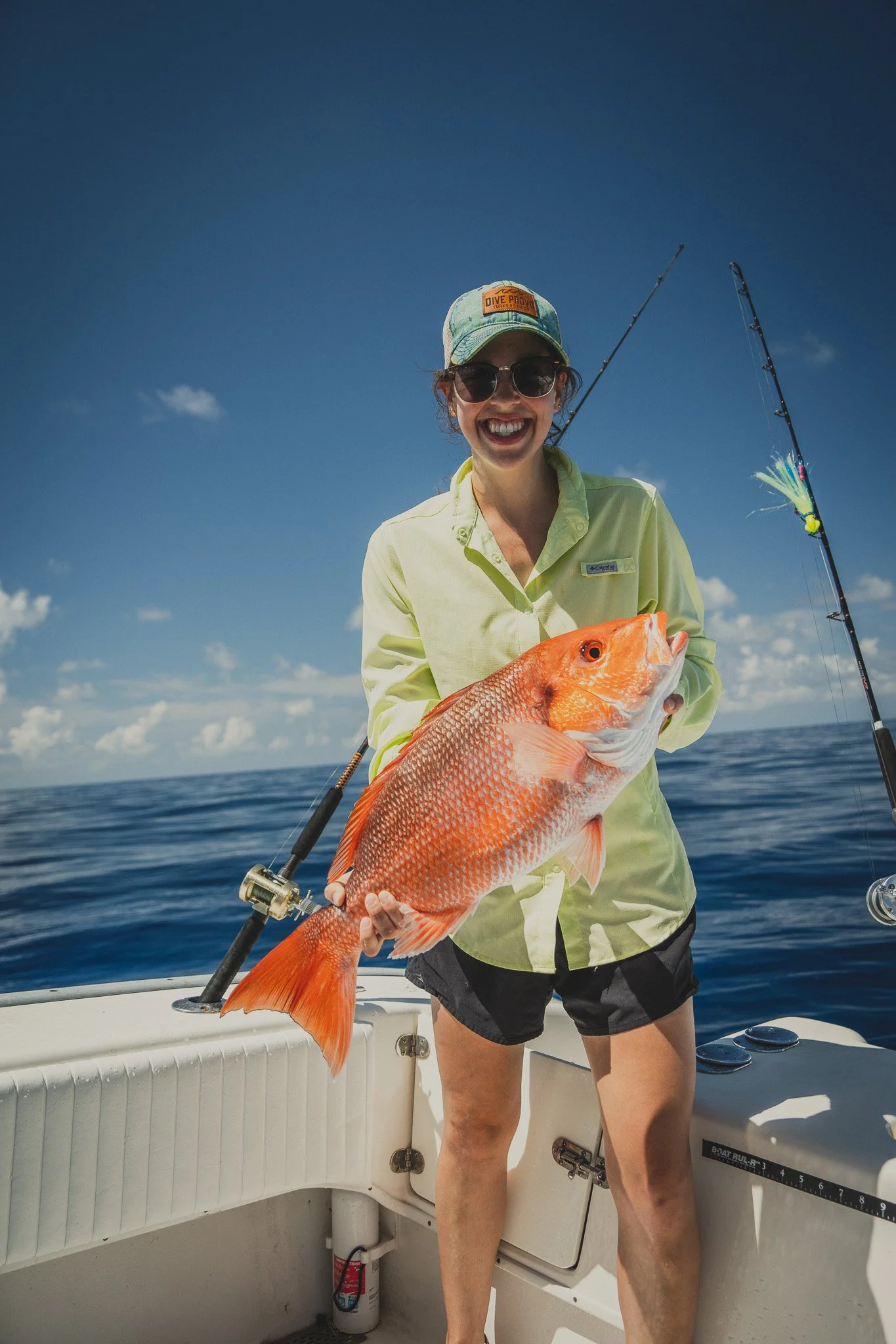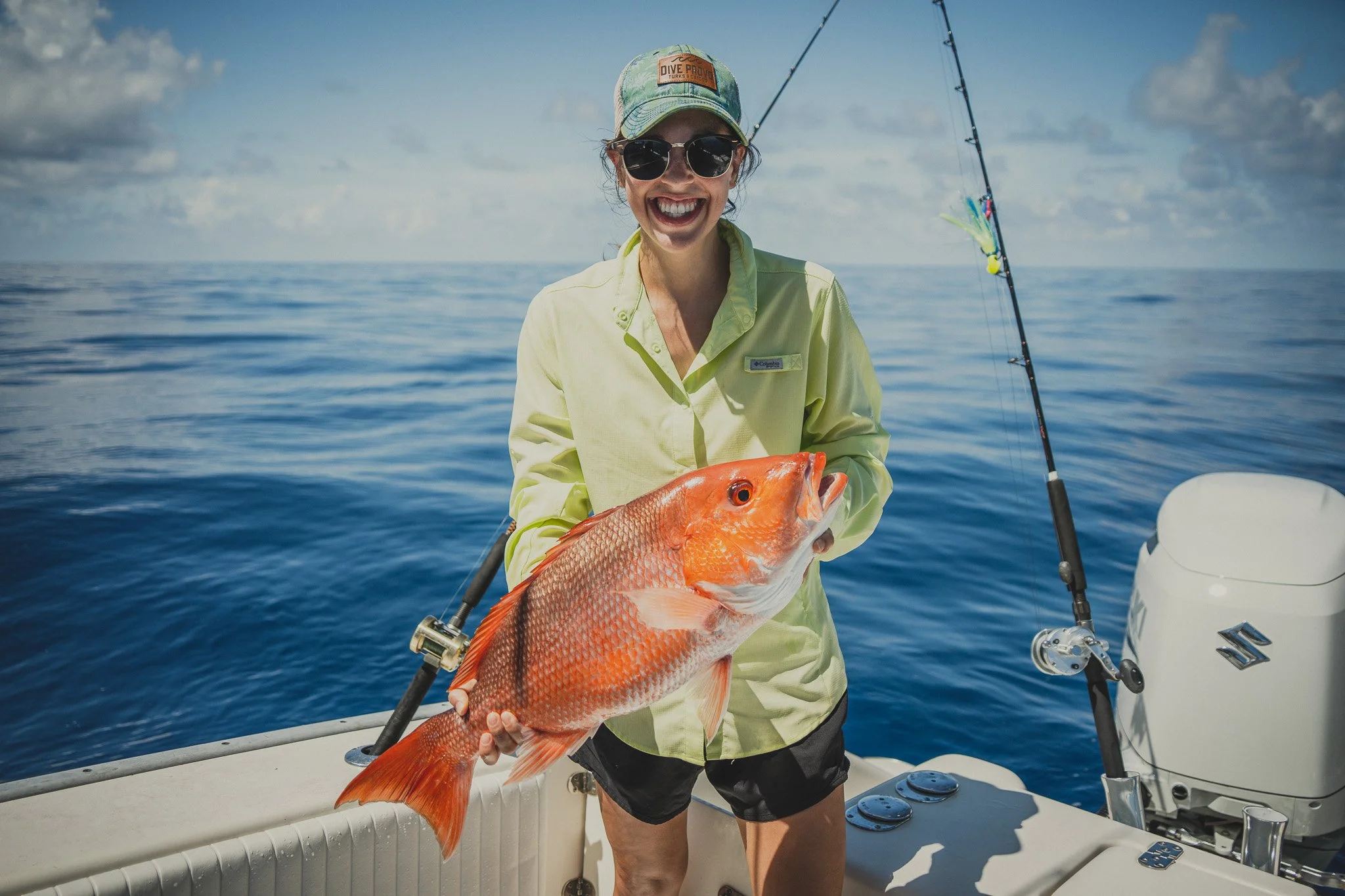 Extremely intelligent Bottlenose Dolphins waiting to snack on an unlucky Red Snapper that is too small to keep. Some escape. Most do not.