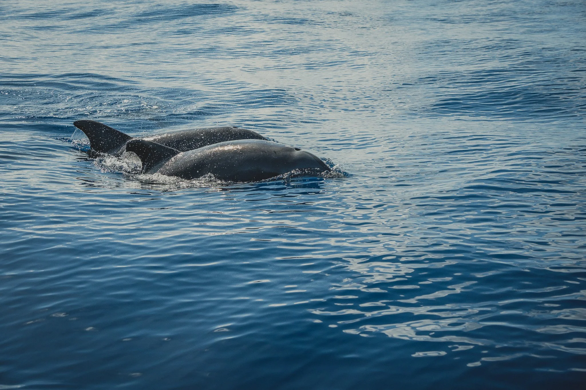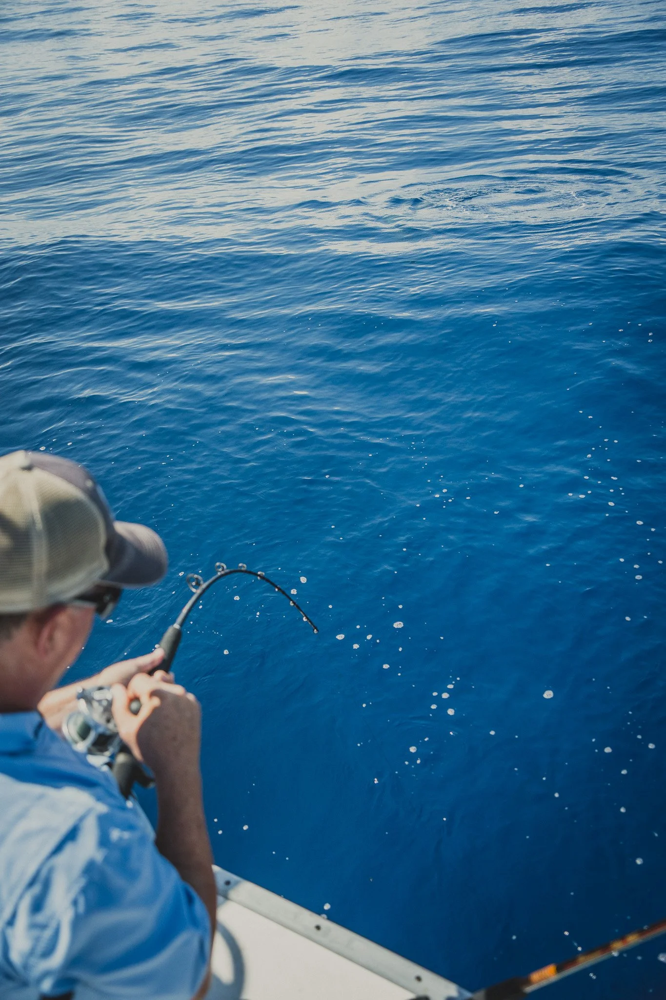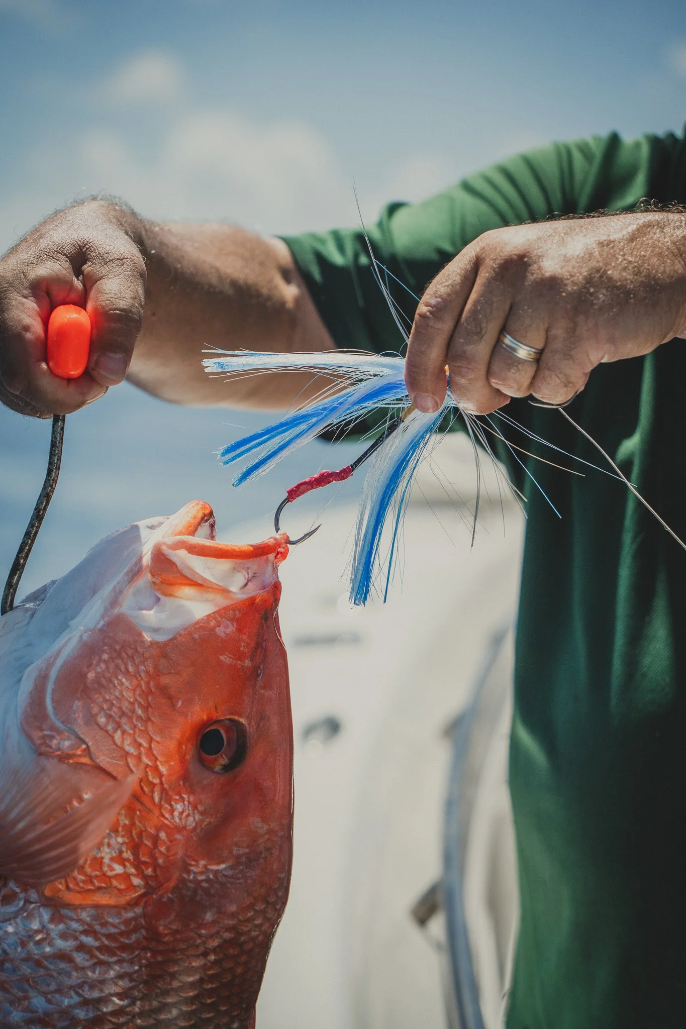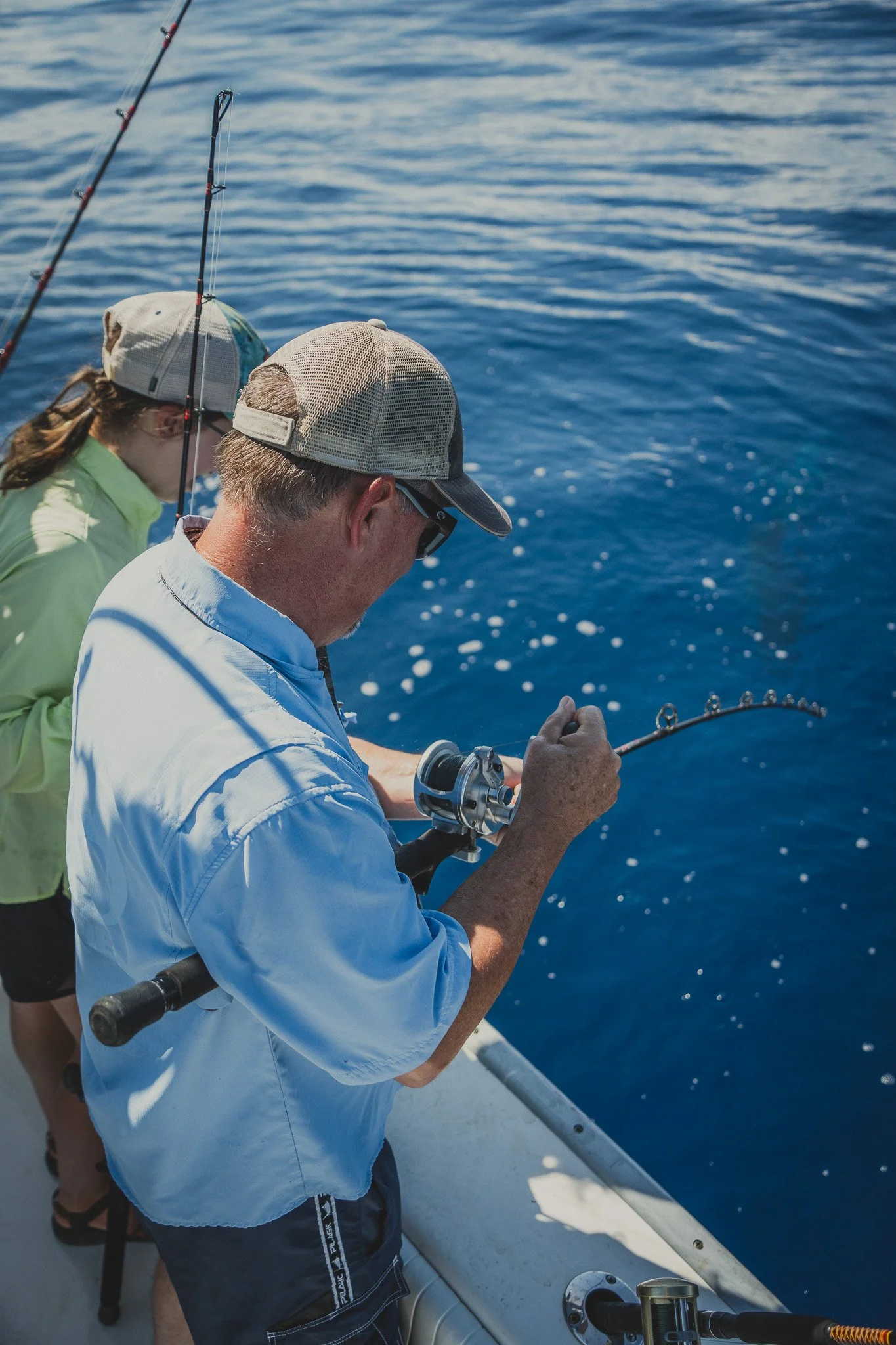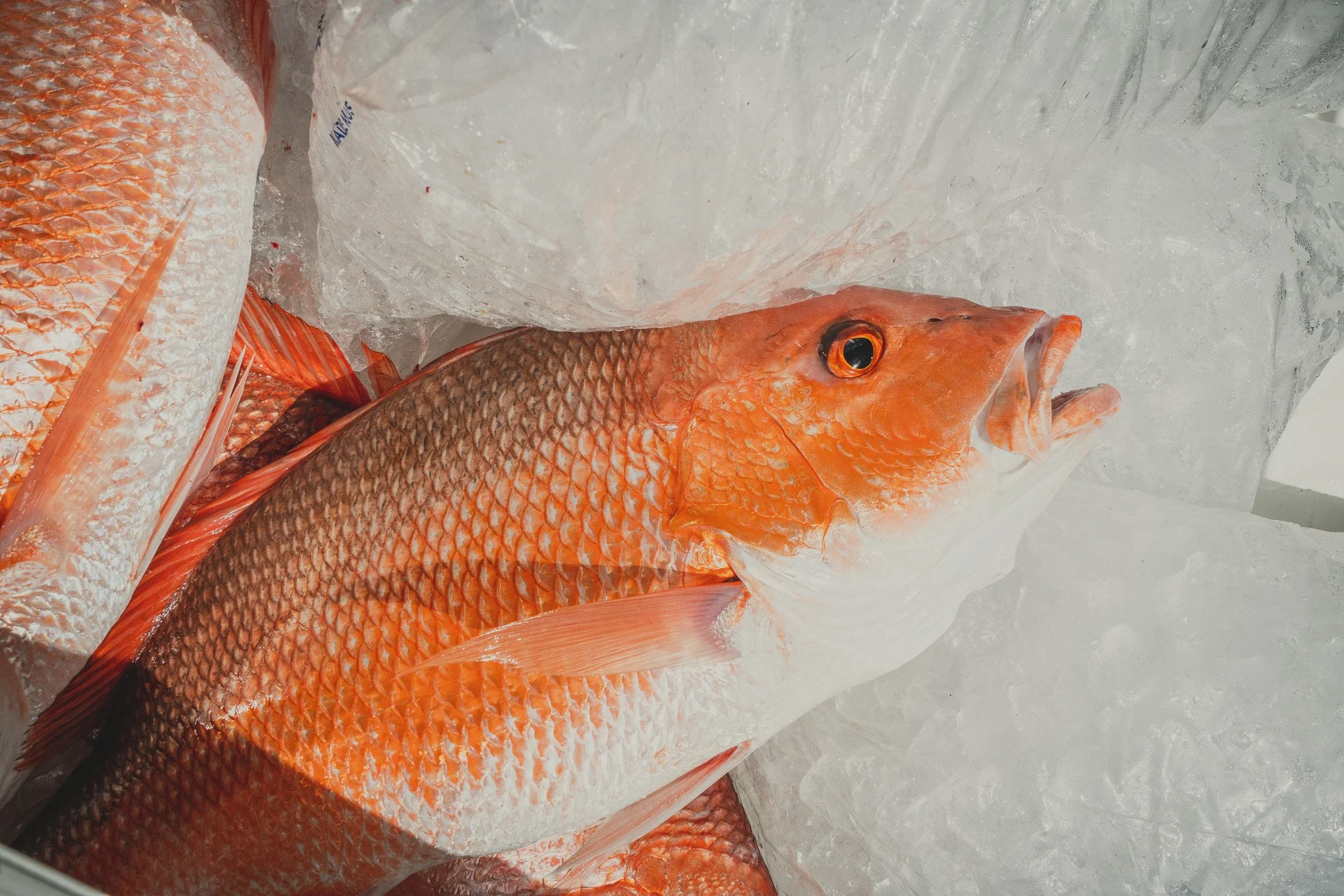 Extremely intelligent Bottlenose Dolphins waiting to snack on an unlucky Red Snapper that is too small to keep. Some escape. Most do not.